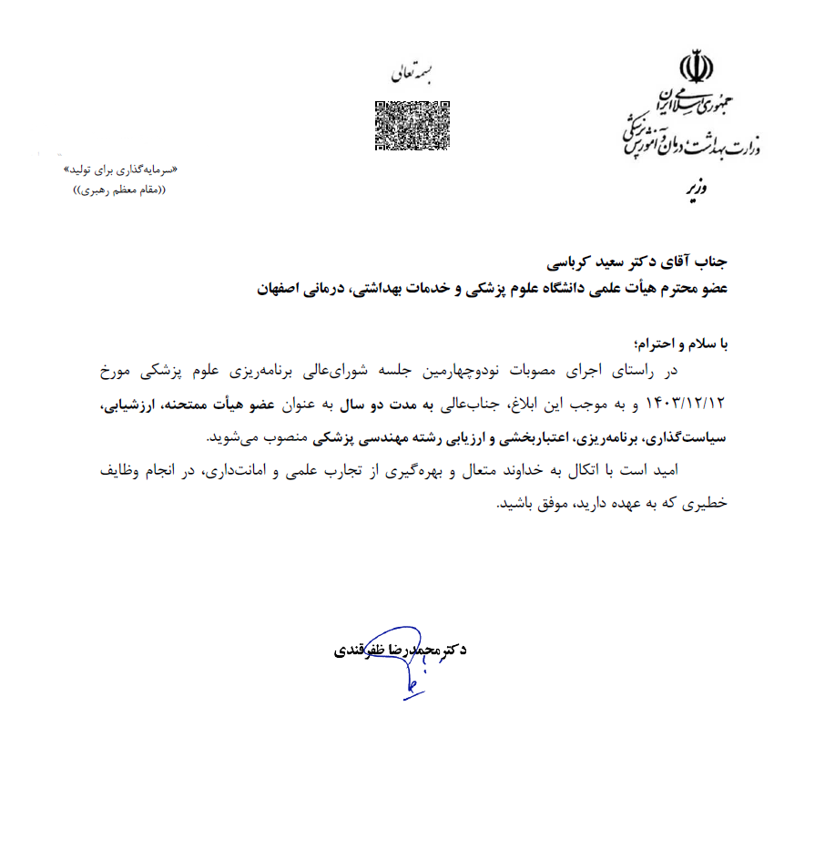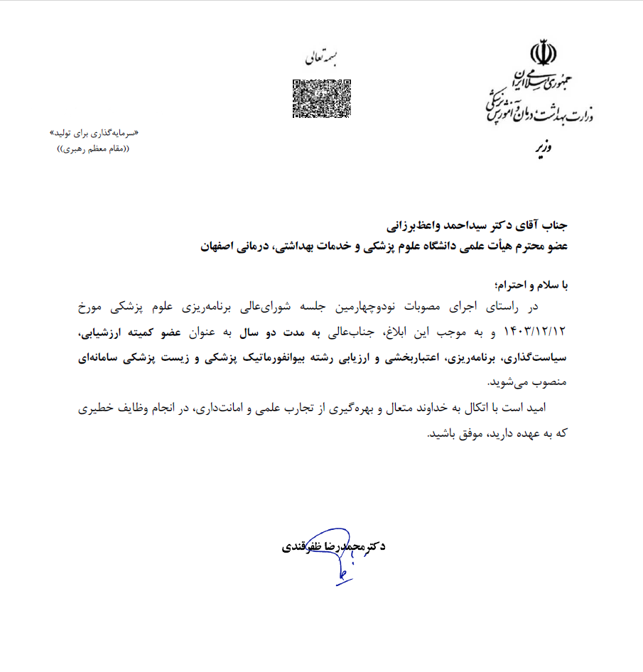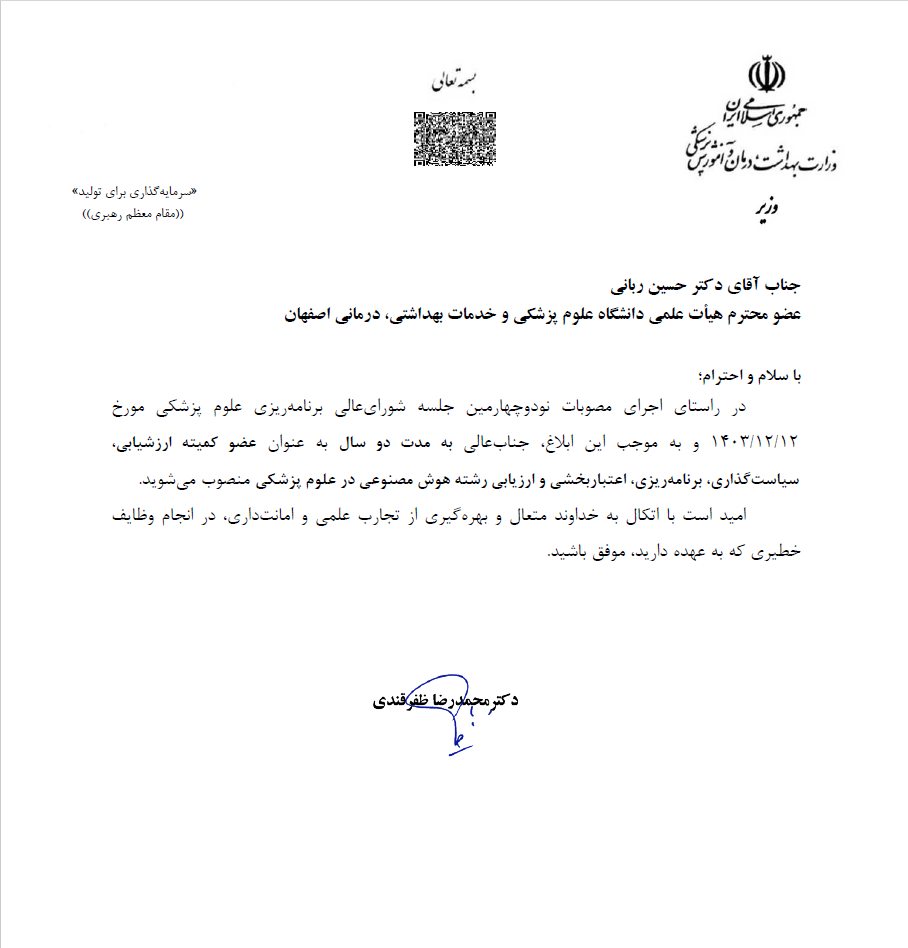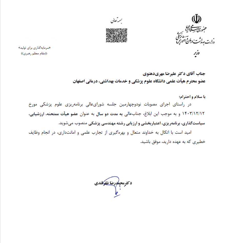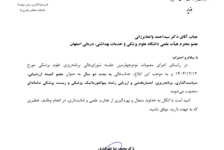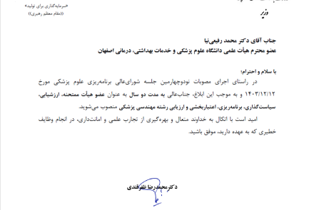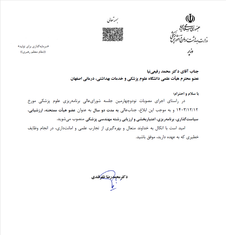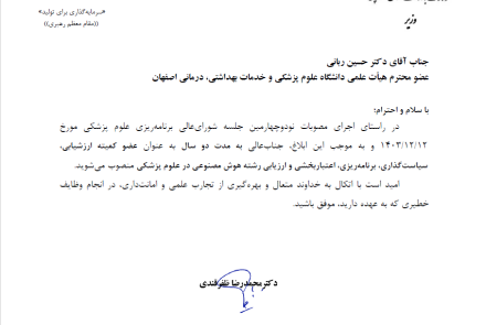 امید است با بهرهگیری از توانمندیهای علمی و اجرایی این استادان گرانقدر، شاهد ارتقای کیفیت آموزشی و برنامهریزی راهبردی در رشتههای تخصصی علوم پزشکی باشیم.
