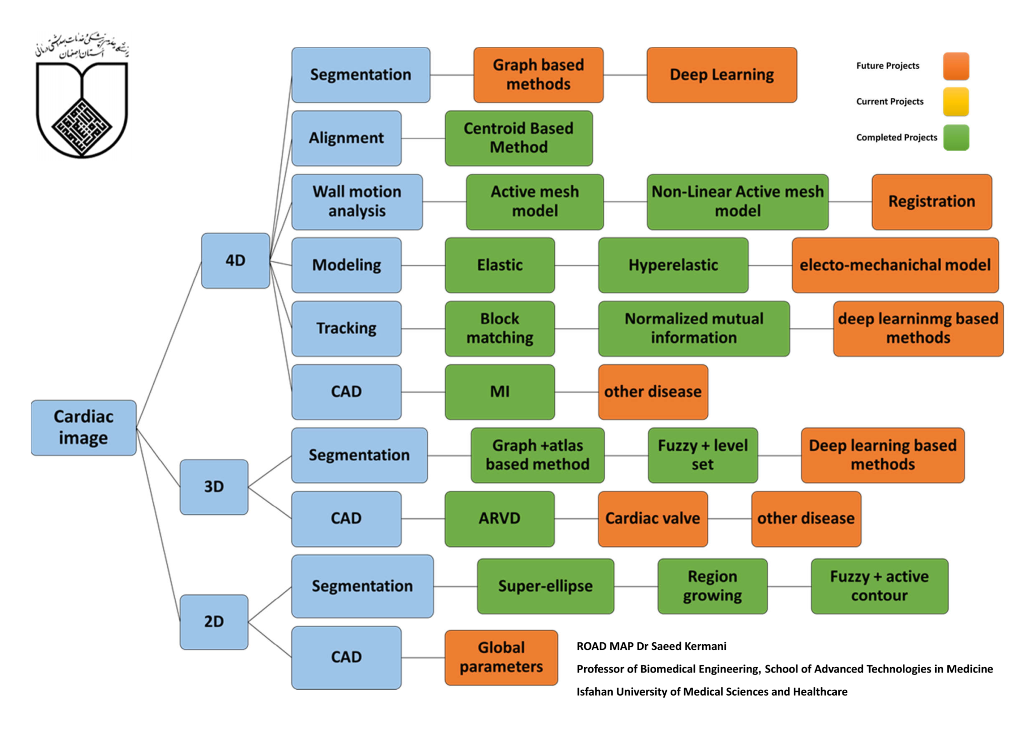 هدف از این هسته انجام فعالیت های ساختارمند بین رشته ای در خصوص پردازش، تجزیه و تحلیل سیگنال الکتروکاردیوگرام ECG و تصاویر قلبی مطابق نقشه مصوب هسته می باشد. این هسته در سال 1395 از شورای پژوهشی دانشگاه موفق به اخذ مجوز گردید. این هسته در تجزیه و تحلیل تصاویر قلبی از مودالیتی MRI و CT مفتخر به تهیه دادگان تصاویر قلبی محلی شامل بیش از سی و دو کیس گردیده است. و در تقطیع و رصد دیواره قلب به صورت اتوماتیک مدلهای مختلفی را پیاده سازی نموده است که حاصل این تلاش مقالات متعدد می باشد. این هسته سه واسطه گرافیکی را هم از الگوریتم های پیشنهادی در عرصه تجزیه و تحلیل تصاویر قلبی پیشنهادی تهیه نموده است که بر روی رایانه های باسطح سخت افزاری متوسط قابل اجرا می باشد و سخت افزارهایی را نیز جهت ثبت ECG و مانیتورینگ علایم حیاتی ارائه نموده است. به پیوست شرح فعالیتهای این هسته در قالب نقشه راه ارائه می گردد که فعالیتهای انجام شده و در حال انجام و فعالیت آتی در قالب رنگ از هم تفکیک و به نمایش گذاشته شده است.