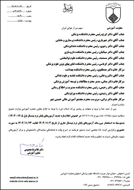 اعلام بازه جدید آزمون¬های پایان ترم نیمسال اول 1405-1404 اعلام بازه جدید آزمونهای پایان ترم نیمسال اول 1405-1404
