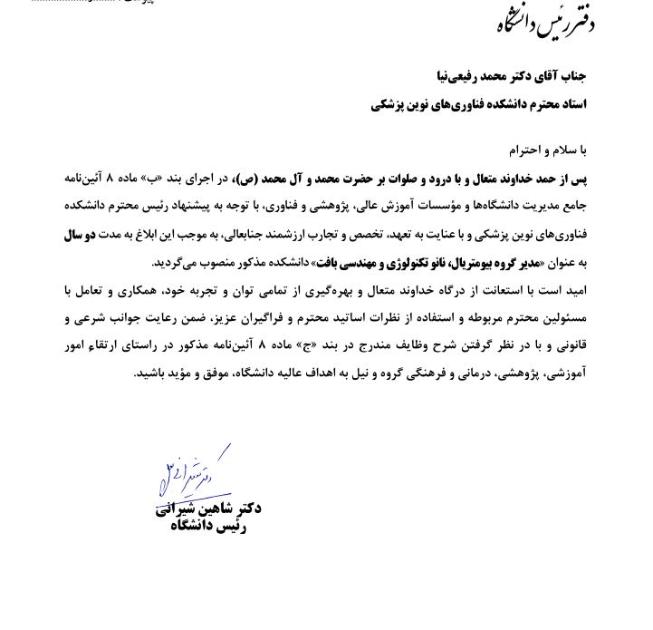 بر اساس ابلاغی از سوی دکتر شاهین شیرانی رییس دانشگاه، جناب آقای دکتر محمدرضا رفیعی نیا به عنوان مدیر گروه بیومتریال، نانو تکنولوژی و مهندسی بافت دانشکده فناوریهای نوین پزشکی دانشگاه منصوب گردید.