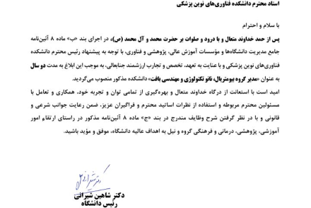انتصاب مدیر گروه بیومتریال، نانو تکنولوژی و مهندسی بافت