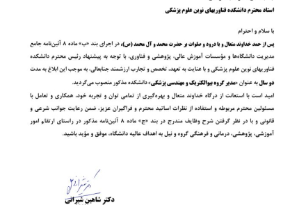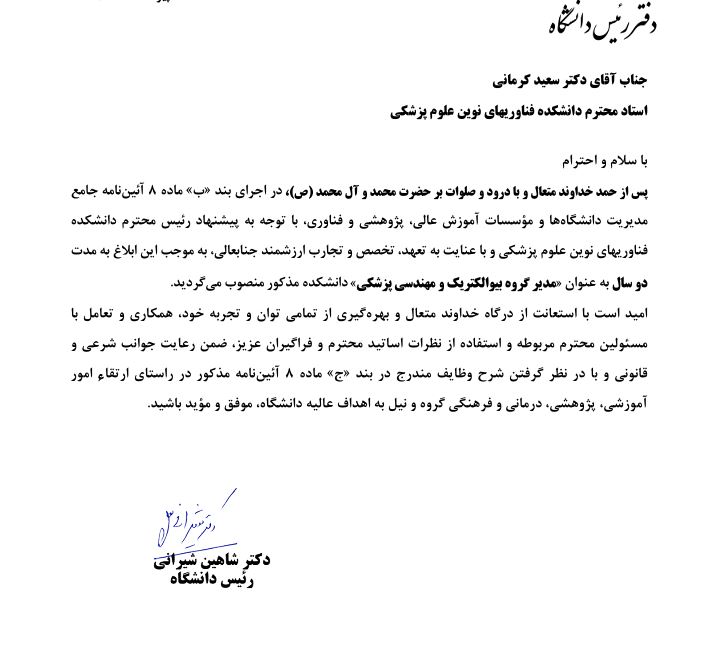 انتصاب مدیر گروه بیوالکتریک و مهندسی پزشکی